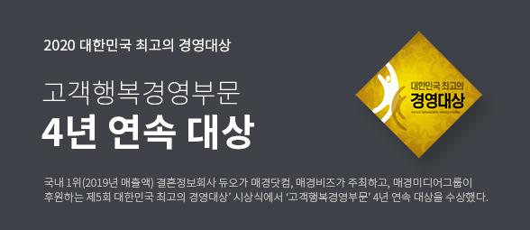 ±¹³» 1À§(2019³â ¸ÅÃâ¾×) °áÈ¥Á¤º¸È¸»ç µà¿À°¡ ¸Å°æ´åÄÄ, ¸Å°æºñÁî°¡ ÁÖÃÖÇϰí, ¸Å°æ¹Ìµð¾î±×·ìÀÌ ÈÄ¿øÇÏ´Â Á¦5ȸ ´ëÇѹα¹ ÃÖ°íÀÇ °æ¿µ´ë»ó¡¯ ½Ã»ó½Ä¿¡¼ ¡®°í°´Çູ°æ¿µºÎ¹®¡¯ 4³â ¿¬¼Ó ´ë»óÀ» ¼ö»óÇß´Ù.